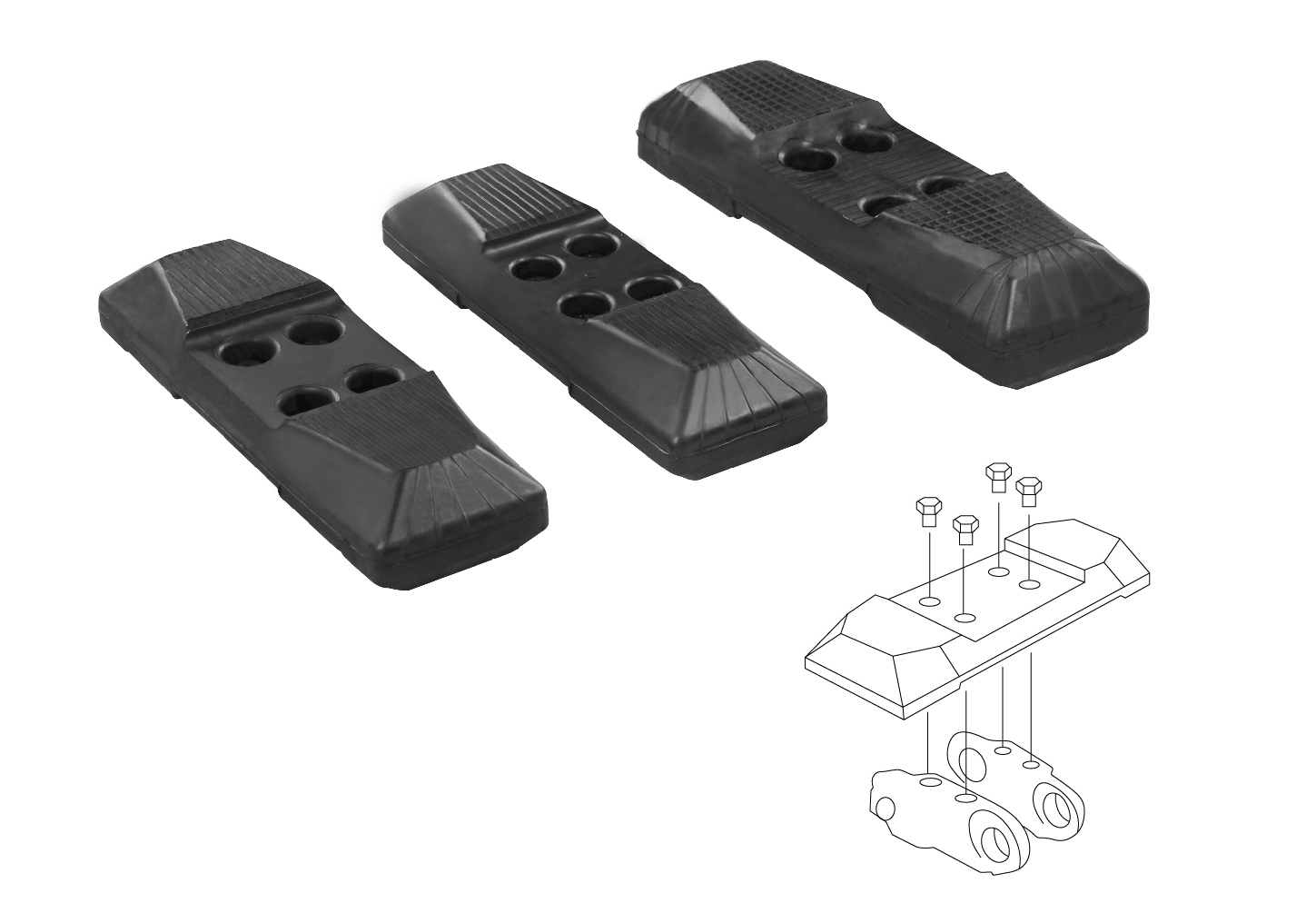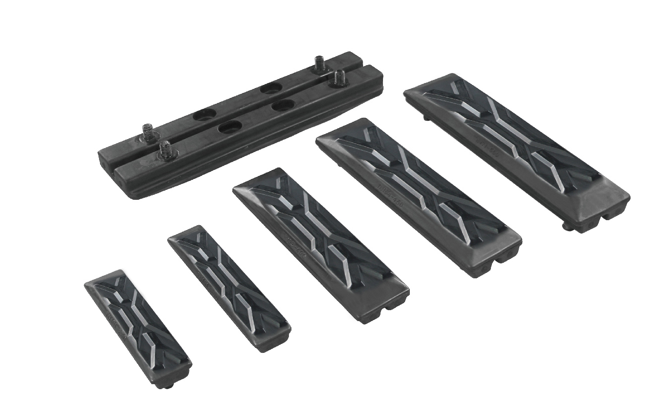 履帶板用在挖掘機,推土機等工程機械的行走機構(gòu),通過簡單地安裝就象鞋子一樣穿在鋼履帶上,達到降低噪音,保護路面的作用。橡膠履帶板產(chǎn)品結(jié)構(gòu)簡單、節(jié)約生產(chǎn)和使用成本。產(chǎn)品耐用、使用壽命長、方便更換、適用多種機型。